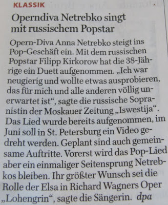 that Anna Netrebko recorded a pop-song with a russian star, Filipp Kirkorow, and will shoot a video clip in June, in St.Petersburg. For the moment it is supposed to remain only one experience -- a single recording, no album planned... as her dream remains to sing Elsa in Lohengrin -- says this short note in Berliner Morgenpost.