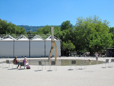 In front of the Theater there is a slightly concaved space holding some water and this big sculpture in the center of that small pool. Plenty of chairs around so you can sit where you want, as you want -- behind is the lake and the walk along is very relaxing.